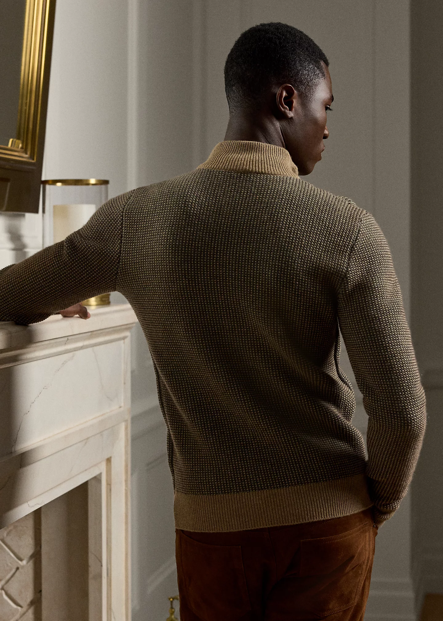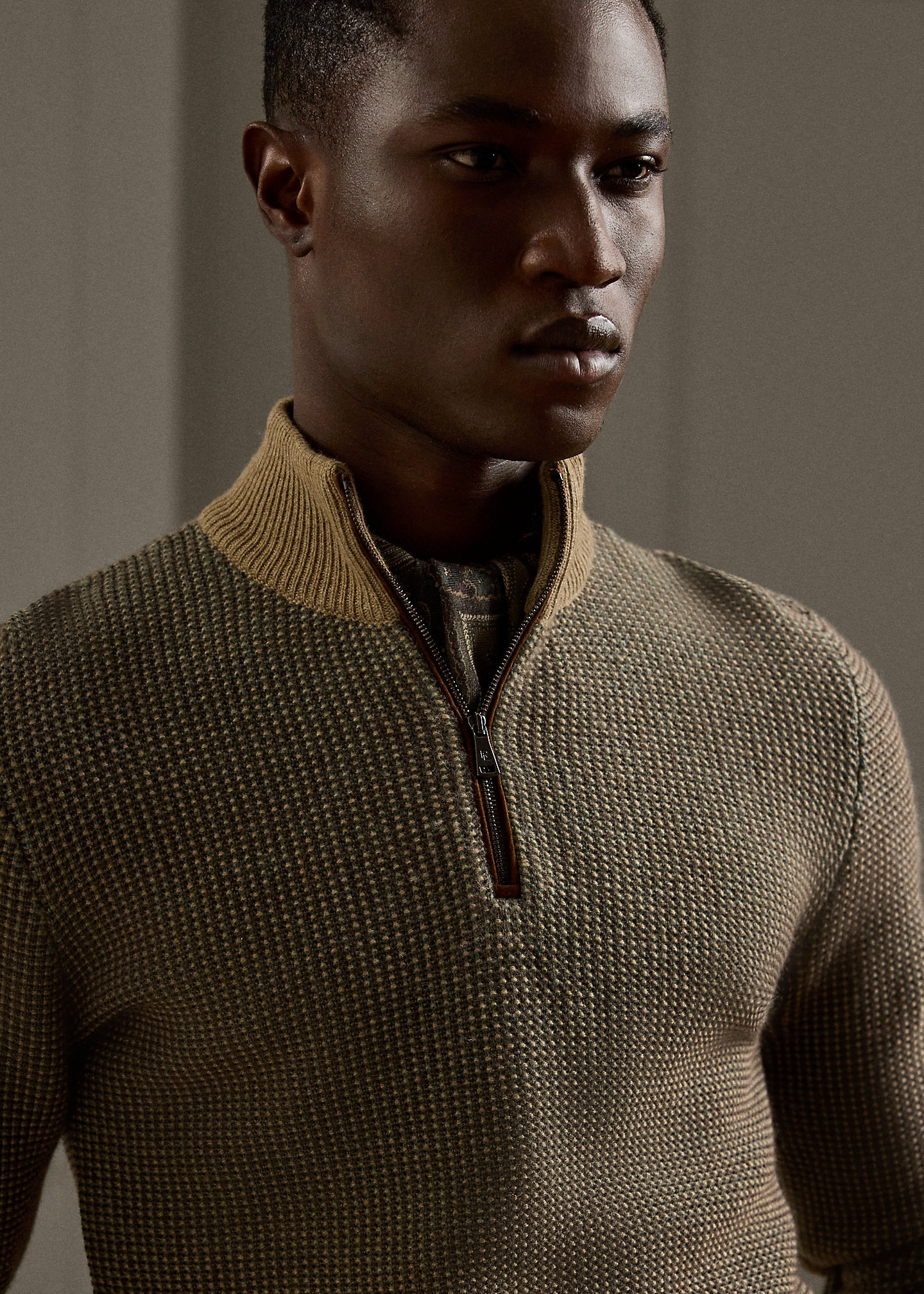 - Rib-knit mockneck. Quarter-zip placket with suede piped trim. Signature zipper.