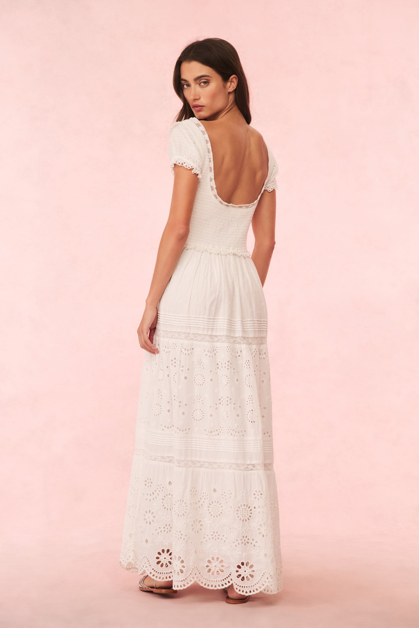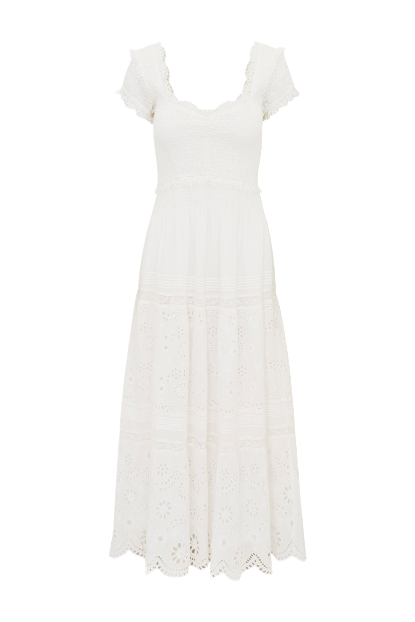 Ethereal and romantic in the Bisolet Dress. This lovely midi dress stuns with a beautiful medley of custom-made, large-scale scallop floral eyelet details mixed with smaller eyelets all over. The daytime dress has a sweeping silhouette, smocking at the bodice for elastication and comfort, short cap sleeves, a scoop neckline, and a tiered, airy skirt.