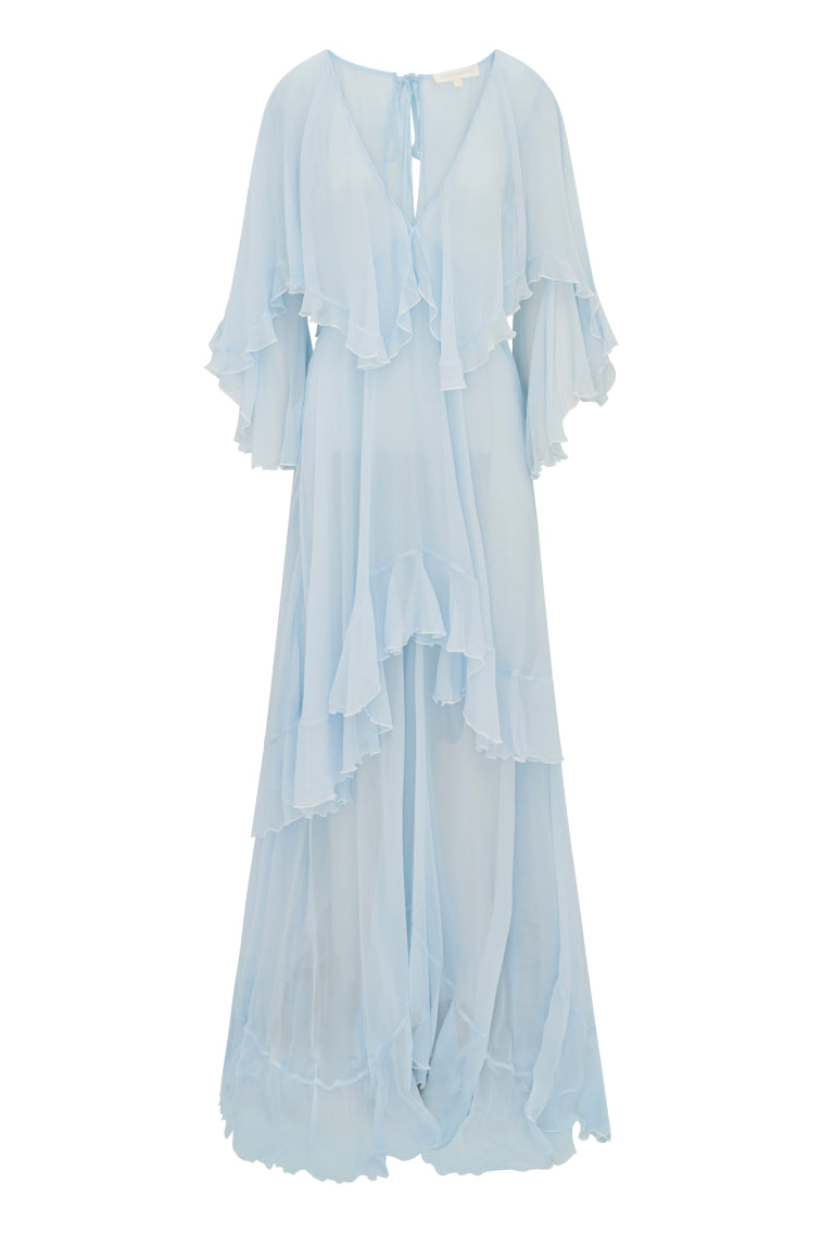 Introducing the Collia Dress. One of the hero pieces of our Spring 2025 runway show and our Founder and Creative Director, Rebecca’s, favorite, Collia Dress debuts with a diaphanous chiffon designed from 100% silk. The viscose, drapey chiffon gives this piece a Bohemian-inspired look and feel. This stunning event gown features a plunging, deep v-neckline with a cape around the shoulders, lovely boho-inspired bell sleeves, a multi-tiered skirt that goes high-to-low at the front then levels out around the hem. Delicate ruffles adorn each tier and the cape. A chiffon self tie detail sits at the back with an open slit. This piece comes fully lined and includes a side seam zipper.