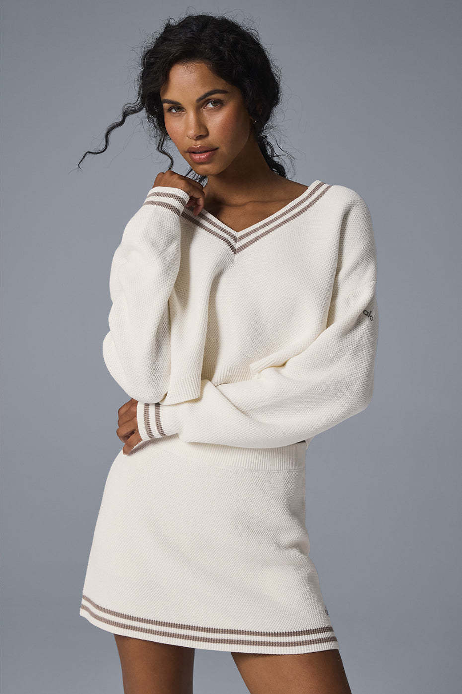 Tennis Club Sweater Knit V-Neck Pullover - Ivory/Gravel