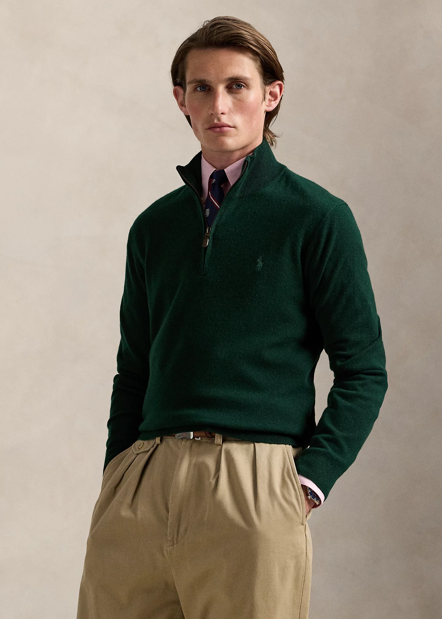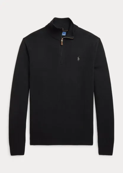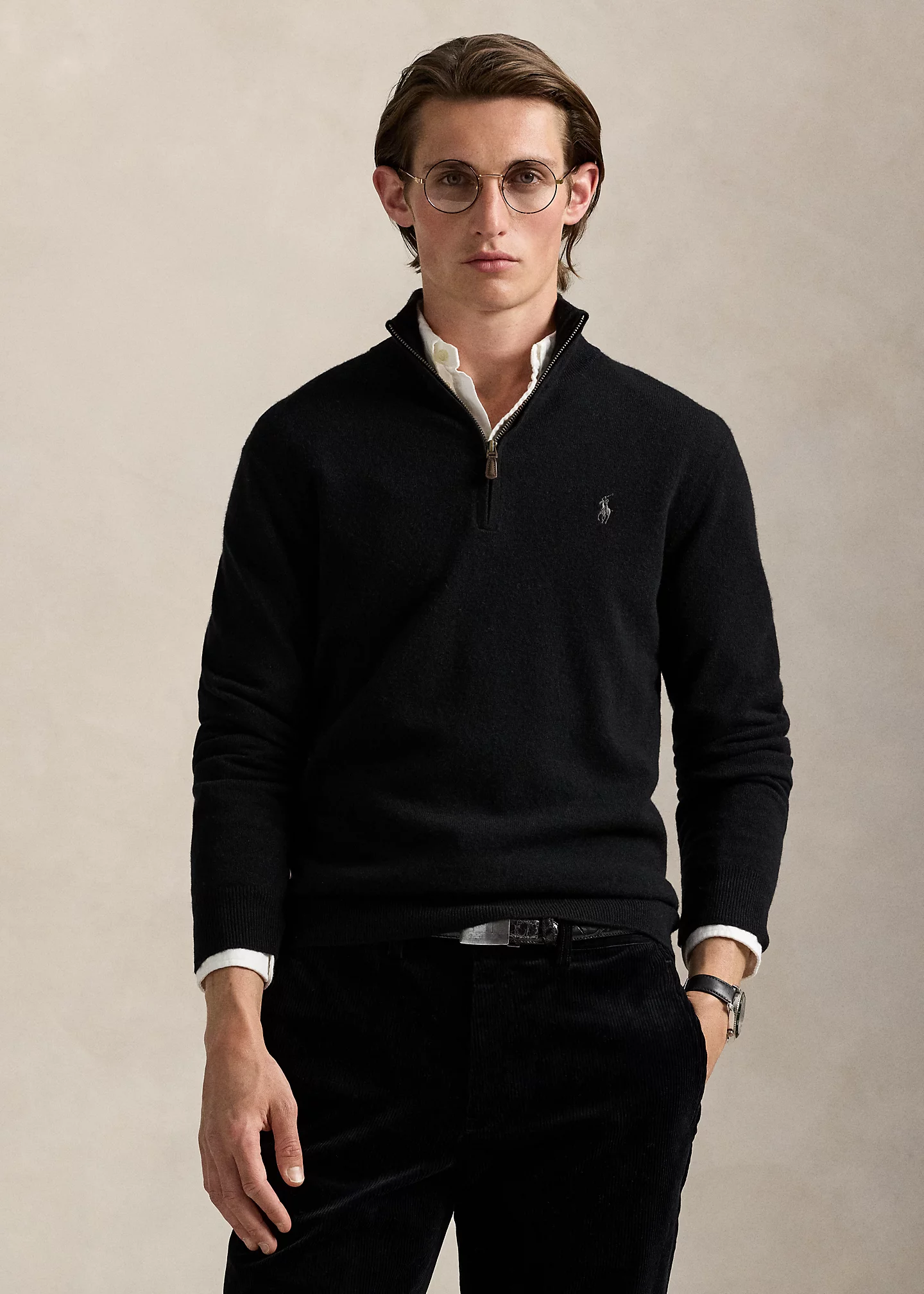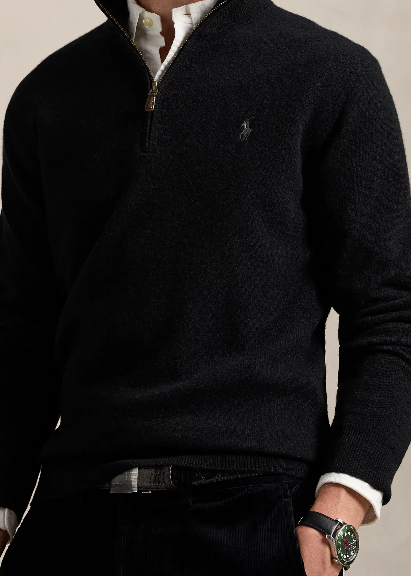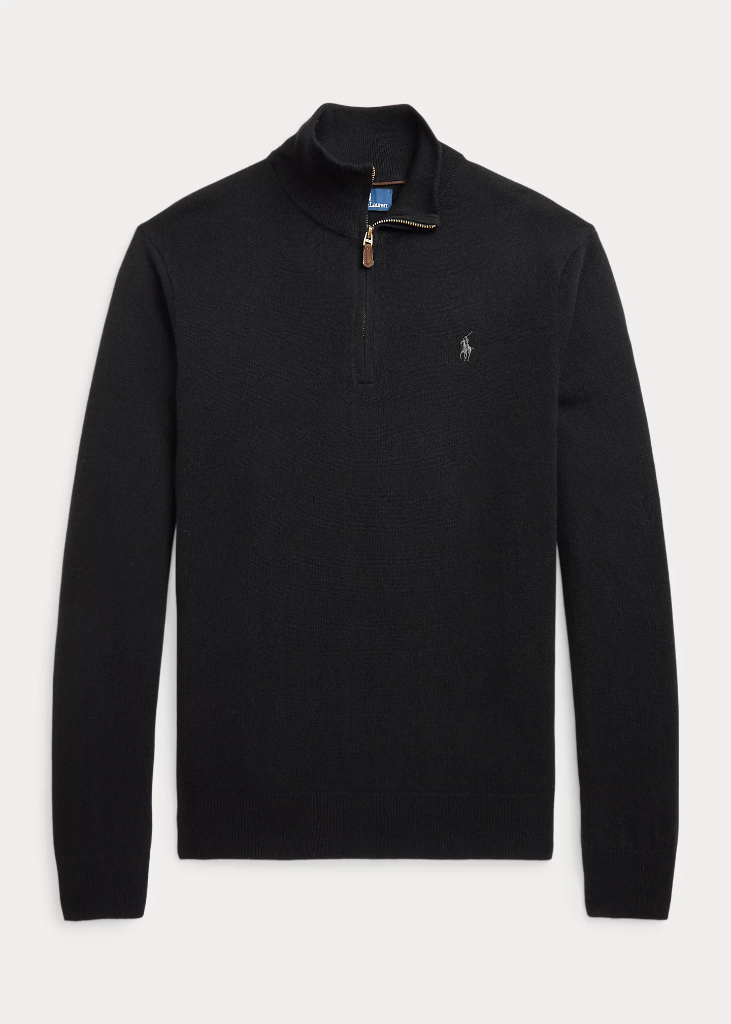 - Rib-knit mockneck. Quarter-zip front with a suede zipper pull. Faux-suede piping at the interior back of the neck.